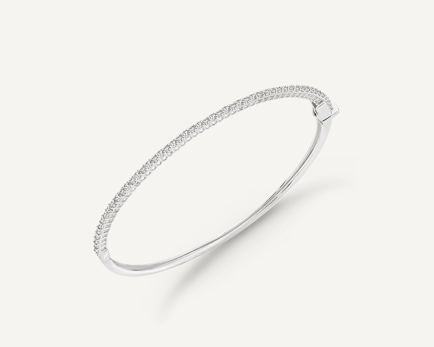 The classic Collection is cool, calm and classic, inviting you to go with the flow in a chic curve of conflict-free diamonds with a total of 1.00 carat. Set in your choice of 18K gold, these diamond bangles exude the charm of traditional eternity bangles in a Luxsso-exclusive design. The diamonds delightfully scatter light from their modern prong settings. Each bangle in this collection has a beautiful weight and moves with its wearer, secured safely with a box clasp.