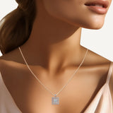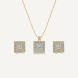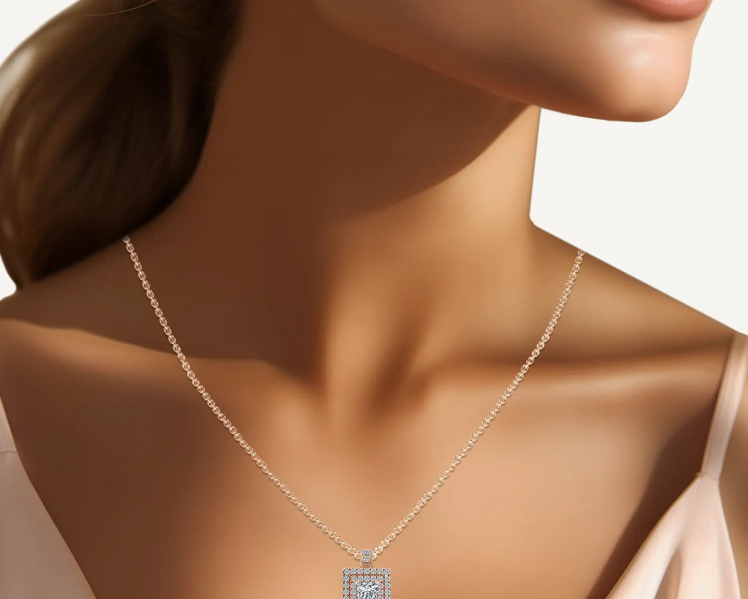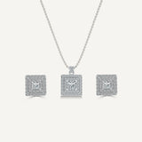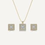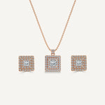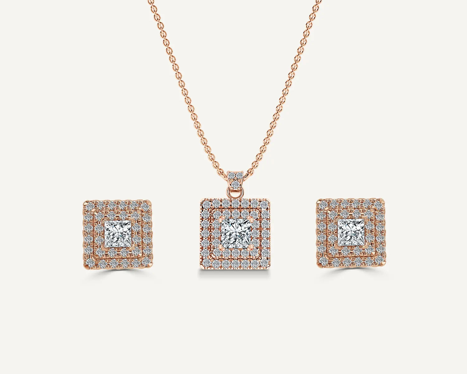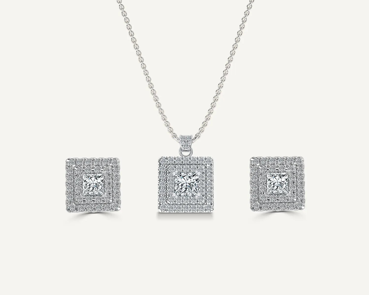 A prong-set one carat diamond set takes centre stage in this fine pendant and earrings, radiating with princess double halos natural diamonds. The sides of the halo set show a delicate scalloped edge. Whether in yellow gold, white gold or rose gold it’s a guaranteed gift that your special someone will be overjoyed to receive.