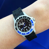 A black and blue kids watch with large numbers along and around the dial. This watch is 5ATM water resistant. To ensure the watch’s longevity we would advise to not wear it while swimming. This is a perfect watch to help children learn how to tell time.